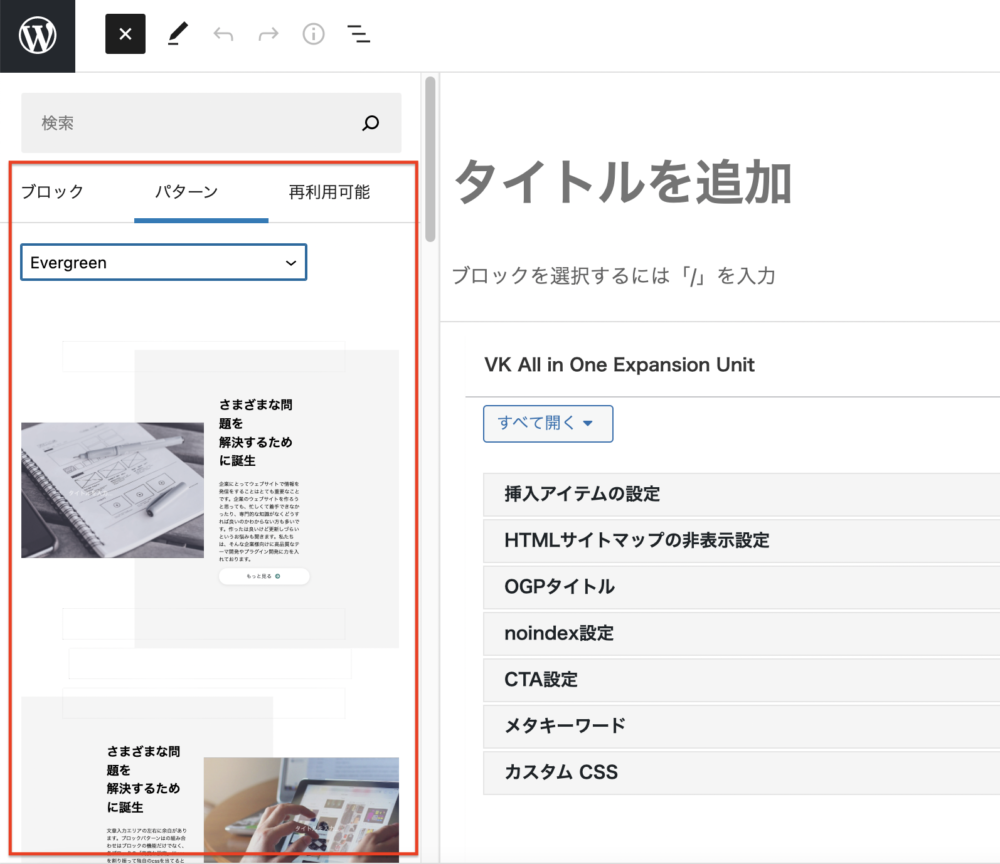 Evergreenスキンには、あえて背景をずらしたオフセット背景が指定できるブロックパターンを搭載しております。