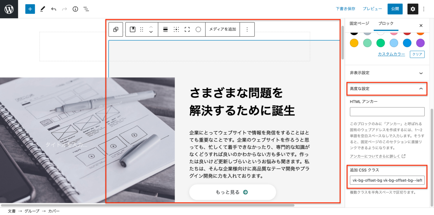 オフセット背景のブロックパターンを配置してから、高度な設定の「追加 CSS クラス」のクラス名を変更するだけで、余白の向きや余白の空きが変更できます。